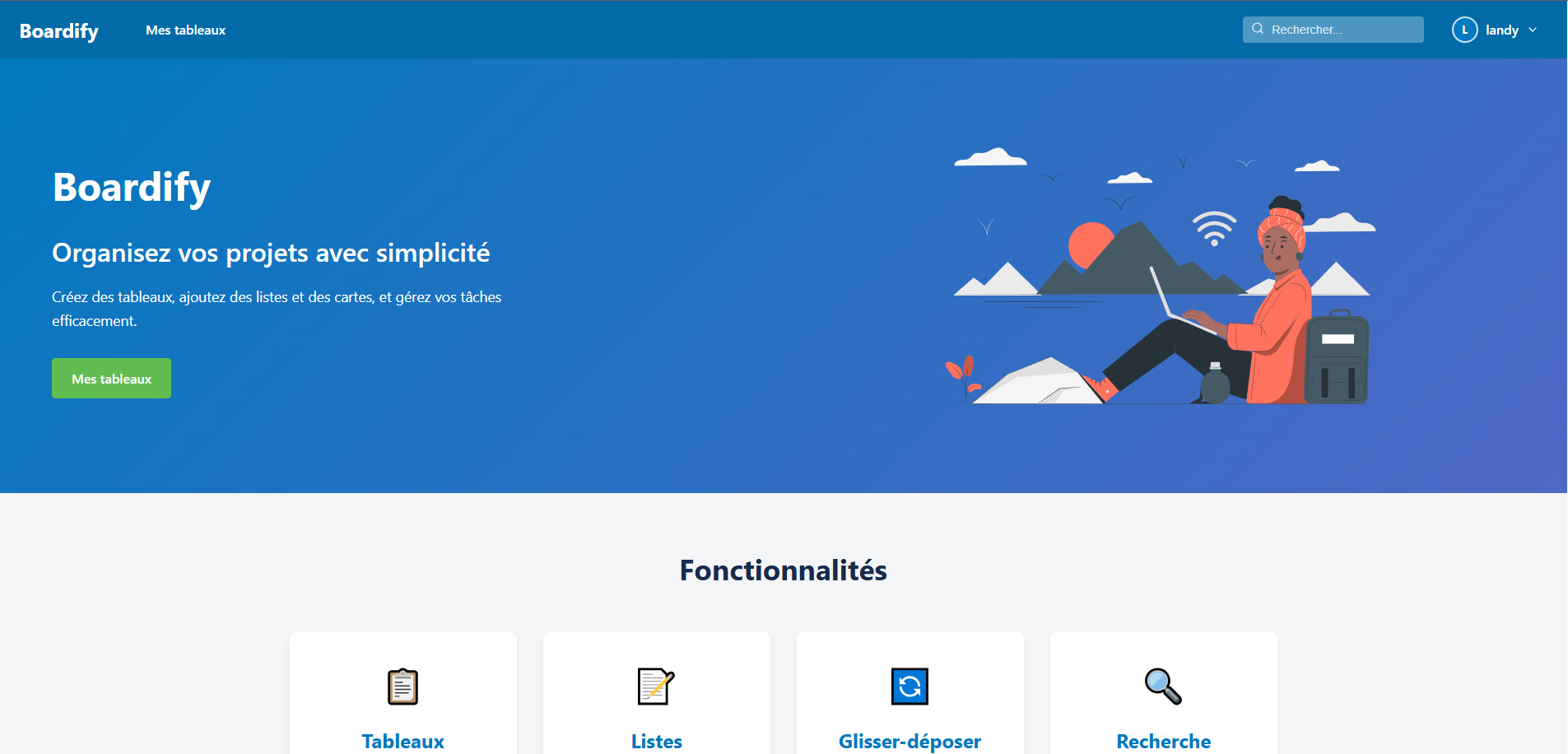 Boardify est une application web développée avec Vue.js, conçue comme un clone de Trello. Elle permet de créer, éditer et supprimer des tableaux, listes et cartes personnalisables, avec un glisser-déposer intuitif, une recherche rapide et le partage de tableaux entre utilisateurs pour faciliter la collaboration.